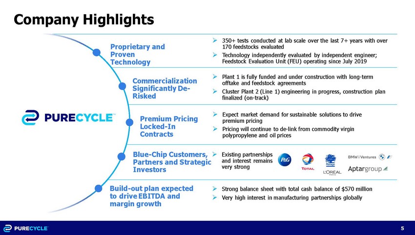 4 4 Execution Roadmap 2016 2018 2020 2021 2022 2023 Initial development of purification process Line engineering begins on cluster plant Plant 1 comes online Q4 2022 Ironton, Ohio facility (Plant 1) fully funded with $250M long term debt Global and U.S. patents filed for purifying contaminated polymers Process and technology reviewed by multinational strategic partners and independently by Leidos 2013 2024 First line of cluster plant comes online summer 2023 1B pounds of installed nameplate capacity