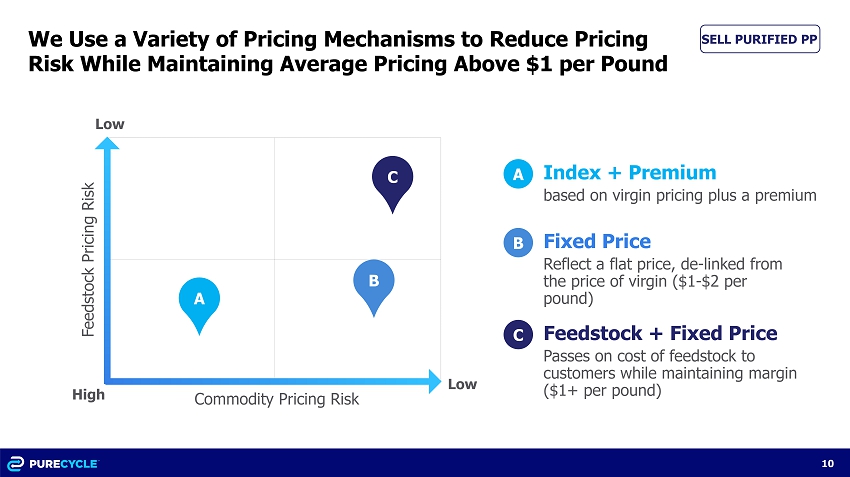 9 9 We are Competitively Positioned to Source Feedstock from Both Curbside and Non - Curbside PP Waste Streams Post Industrial Advocacy Post Consumer Non - Curbside Post Consumer Curbside FIND WASTE PP PureCycle is targeting high - and low - value PP streams before they enter the waste infrastructure systems to capture the maximum percent of PP • Direct from manufacturing • Label mis - prints • Compounding waste • Virgin production waste • Brokered waste • New PP collection • PP conversion • Strategic alignment • Local, regional, national relations • Industry representation • Co - recycling • International import • Special events • Circularity programs / targeted streams • # 5 bales • #3 - #7 bales • Targeted partnerships