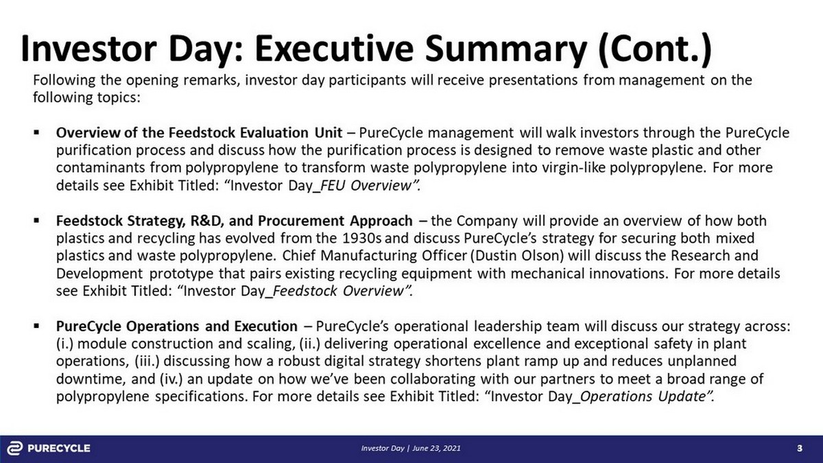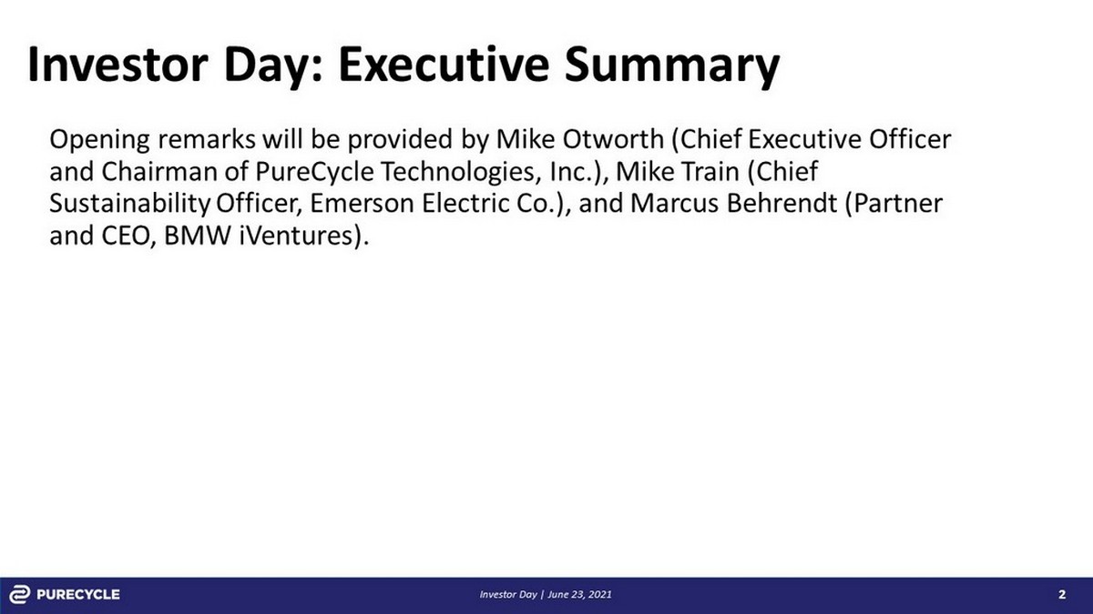 2 Investor Day | June 23, 2021 2 Investor Day: Executive Summary Opening remarks will be provided by Mike Otworth (Chief Executive Officer and Chairman of PureCycle Technologies, Inc.), Mike Train (Chief Sustainability Officer, Emerson Electric Co.), and Marcus Behrendt (Partner and CEO, BMW iVentures).