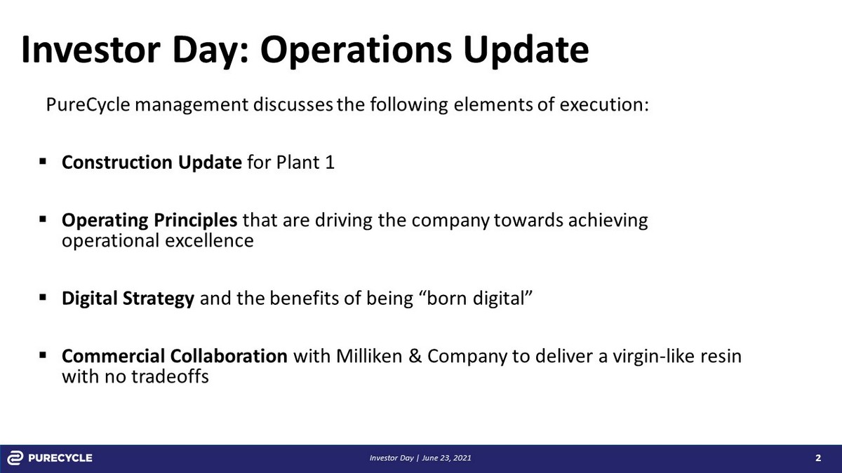 2 Investor Day | June 23, 2021 2 Investor Day: Operations Update PureCycle management discusses the following elements of execution: ▪ Construction Update for Plant 1 ▪ Operating Principles that are driving the company towards achieving operational excellence ▪ Digital Strategy and the benefits of being “born digital” ▪ Commercial Collaboration with Milliken & Company to deliver a virgin - like resin with no tradeoffs