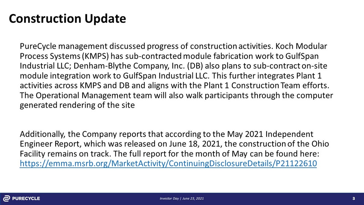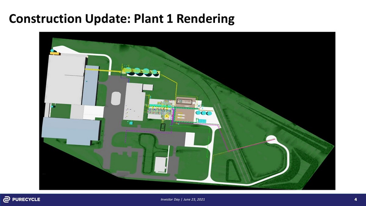3 Investor Day | June 23, 2021 3 Construction Update PureCycle management discussed progress of construction activities. Koch Modular Process Systems (KMPS) has sub - contracted module fabrication work to GulfSpan Industrial LLC; Denham - Blythe Company, Inc. (DB) also plans to sub - contract on - site module integration work to GulfSpan Industrial LLC. This further integrates Plant 1 activities across KMPS and DB and aligns with the Plant 1 Construction Team efforts. The Operational Management team will also walk participants through the computer generated rendering of the site Additionally, the Company reports that according to the May 2021 Independent Engineer Report, which was released on June 18, 2021, the construction of the Ohio Facility remains on track. The full report for the month of May can be found here: https://emma.msrb.org/MarketActivity/ContinuingDisclosureDetails/P21122610