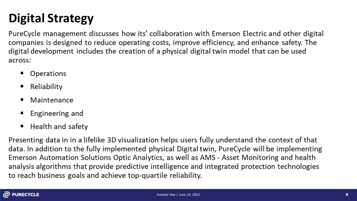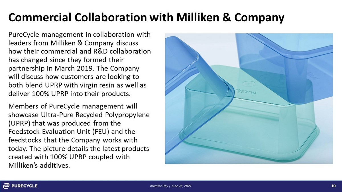 9 Investor Day | June 23, 2021 9 Digital Strategy PureCycle management discusses how its’ collaboration with Emerson Electric and other digital companies is designed to reduce operating costs, improve efficiency, and enhance safety. The digital development includes the creation of a physical digital twin model that can be used across: ▪ Operations ▪ Reliability ▪ Maintenance ▪ Engineering and ▪ Health and safety Presenting data in in a lifelike 3D visualization helps users fully understand the context of that data. In addition to the fully implemented physical Digital twin, PureCycle will be implementing Emerson Automation Solutions Optic Analytics, as well as AMS - Asset Monitoring and health analysis algorithms that provide predictive intelligence and integrated protection technologies to reach business goals and achieve top - quartile reliability.