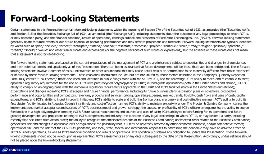 | 99.2 | PureCycle Technologies, Inc. presentation to investors. | |