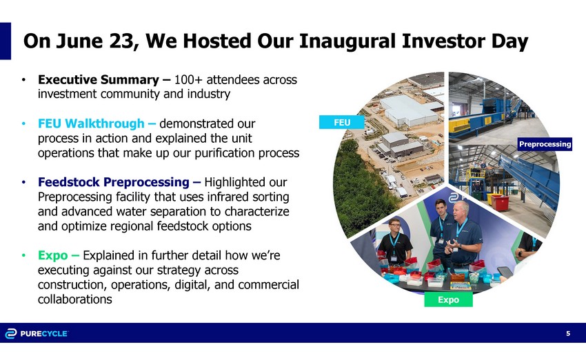 Forward - Looking Statements 2 Certain statements in this Presentation contain forward - looking statements within the meaning of Section 27A of the Securities Act of 1933, as amended (the “Securities Act”), and Section 21E of the Securities Exchange Act of 1934, as amended (the “Exchange Act”), including statements about the outcome of any legal proceedings to which PCT is, or may become a party, and the financial condition, results of operations, earnings outlook and prospects of PureCycle Technologies, Inc. (“PCT”). Forward - looking statements generally relate to future events or our future financial or operating performance and may refer to projections and forecasts. Forward - looking statements are typically identified by words such as “plan,” “believe,” “expect,” “anticipate,” “intend,” “outlook,” “estimate,” “forecast,” “project,” “continue,” “could,” “may,” “might,” “possible,” “potential,” “predict,” “should,” “would” and other similar words and expressions (or the negative versions of such words or expressions), but the absence of these words does not mean that a statement is not forward - looking. The forward - looking statements are based on the current expectations of the management of PCT and are inherently subject to uncertainties and changes in circumstances and their potential effects and speak only as of this Presentation. There can be no assurance that future developments will be those that have been anticipated. These forward - looking statements involve a number of risks, uncertainties or other assumptions that may cause actual results or performance to be materially different from those expressed or implied by these forward - looking statements. These risks and uncertainties include, but are not limited to, those factors described in the Company’s Quarterly Report on Form 10 - Q entitled “Risk Factors,” those discussed and identified in public filings made with the SEC by PCT, and the following: PCT's ability to meet, and to continue to meet, applicable regulatory requirements for the use of PCT’s ultra - pure recycled polypropylene (“UPRP”) in food grade applications (both in the United States and abroad); PCT's ability to comply on an ongoing basis with the numerous regulatory requirements applicable to the UPRP and PCT’s facilities (both in the United States and abroad); Expectations and changes regarding PCT’s strategies and future financial performance, including its future business plans, expansion plans or objectives, prospective performance and opportunities and competitors, revenues, products and services, pricing, operating expenses, market trends, liquidity, cash flows and uses of cash, capital expenditures, and PCT’s ability to invest in growth initiatives; PCT’s ability to scale and build the Ironton plant in a timely and cost - effective manner; PCT’s ability to build its first cluster facility, located in Augusta, Georgia in a timely and cost - effective manner; PCT’s ability to maintain exclusivity under The Procter & Gamble Company license; the implementation, market acceptance and success of PCT’s business model and growth strategy; the success or profitability of PCT’s offtake arrangements; the ability to source feedstock with a high polypropylene content; PCT’s future capital requirements and sources and uses of cash; PCT’s ability to obtain funding for its operations and future growth; developments and projections relating to PCT’s competitors and industry; the outcome of any legal proceedings to which PCT is, or may become a party, including recently filed securities class action cases; the ability to recognize the anticipated benefits of the Business Combination; unexpected costs related to the Business Combination; geopolitical risk and changes in applicable laws or regulations; the possibility that PCT may be adversely affected by other economic, business, and/or competitive factors; operational risk; and the risk that the COVID - 19 pandemic, and local, state, federal and international responses to addressing the pandemic may have an adverse effect on PCT’s business operations, as well as PCT’s financial condition and results of operations. PCT specifically disclaims any obligation to update this Presentation. These forward - looking statements should not be relied upon as representing PCT’s assessments as of any date subsequent to the date of this Presentation. Accordingly, undue reliance should not be placed upon the forward - looking statements.