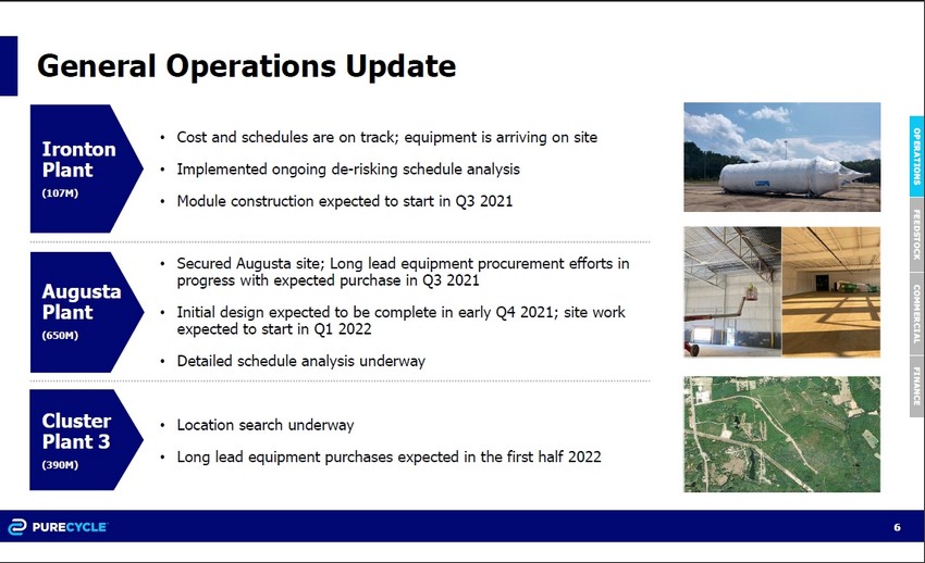 The Company’s Plant 1 in Ironton, Ohio remains on cost and schedule, while equipment is currently arriving on site. Module construction is expected to begin in the third quarter of 2021. PureCycle continues to expect commissioning of Plant 1 in the fourth quarter of 2022 with total installed capacity of 107 million pounds.