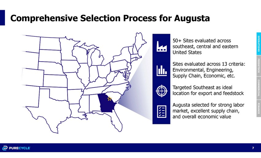 General Operations Update • Cost and schedules are on track; equipment is arriving on site • Implemented ongoing de - risking schedule analysis • Module construction expected to start in Q3 2021 O PER A T I ON S F E ED ST O C K COMMERCIAL FINANCE • Secured Augusta site; Long lead equipment procurement efforts in progress with expected purchase in Q3 2021 • Initial design expected to be complete in early Q4 2021; site work expected to start in Q1 2022 • Detailed schedule analysis underway • Location search underway • Long lead equipment purchases expected in the first half 2022 I r o n t o n Plant (107M) A u g u s t a Plant (650M) C lu s t e r Plant 3 (390M) 6