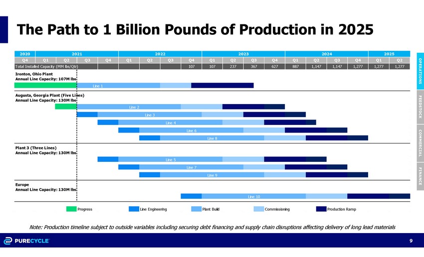 • Optimized Infrastructure – industrial park with access to electricity and natural gas at site boundary • Engineering – initial design nearing completion; permitting activities in process Augusta Delivers Strong Value and Global Reach Substation 230kV transmission lines Norfolk Southern Line O PER A T I ON S F E ED ST O C K COMMERCIAL FINANCE • Strong Labor Market – broad access to specialized skillsets with favorable economics • Ideal Community – strong local community with site located within an industrial park • Advanced Supply Chain – interstate and rail access to reduce inbound/outbound costs • Access to Feedstock – ideal location to obtain both local and region feedstock • Global Reach – Close proximity to multiple ports, including Port of Savannah 8