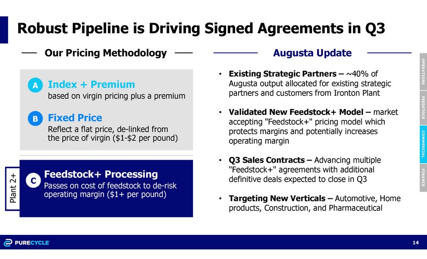 Robust Pipeline is Driving Signed Agreements in Q3 Index + Premium based on virgin pricing plus a premium A B Fixed Price Reflect a flat price, de - linked from the price of virgin ($1 - $2 per pound) O PER A T I ON S F E ED ST O C K COMMERCIAL FINANCE Our Pricing Methodology Augusta Update • Existing Strategic Partners – ~40% of Augusta output allocated for existing strategic partners and customers from Ironton Plant • Validated New Feedstock+ Model – market accepting "Feedstock+" pricing model which protects margins and potentially increases operating margin • Q3 Sales Contracts – Advancing multiple "Feedstock+" agreements with additional definitive deals expected to close in Q3 • Targeting New Verticals – Automotive, Home products, Construction, and Pharmaceutical Plant 2+ C Feedstock+ Processing Passes on cost of feedstock to de - risk operating margin ($1+ per pound) 14
