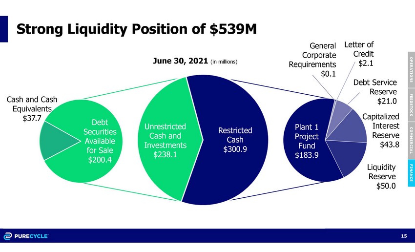 Total liquidity of $539.0 million included $238.1 million of cash, cash equivalents and debt securities available for sale and $300.9 million in restricted cash, at quarter end June 30, 2021. PureCycle had gross debt of $313.6 million as of June 30, 2021. This included $62.5 million of notes payable and accrued interest and $251.1 million of bonds payable and accrued interest.