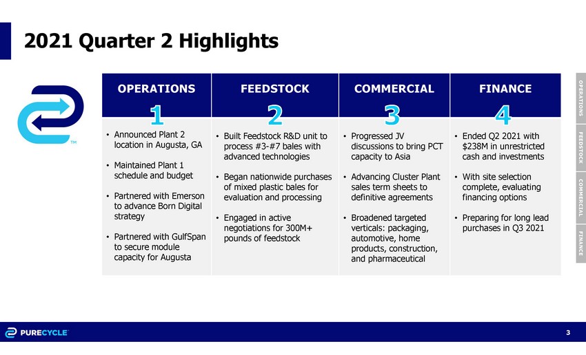 Forward - Looking Statements 2 Certain statements in this Presentation contain forward - looking statements within the meaning of Section 27A of the Securities Act of 1933, as amended (the “Securities Act”), and Section 21E of the Securities Exchange Act of 1934, as amended (the “Exchange Act”), including statements about the outcome of any legal proceedings to which PCT is, or may become a party, and the financial condition, results of operations, earnings outlook and prospects of PureCycle Technologies, Inc. (“PCT”). Forward - looking statements generally relate to future events or our future financial or operating performance and may refer to projections and forecasts. Forward - looking statements are typically identified by words such as “plan,” “believe,” “expect,” “anticipate,” “intend,” “outlook,” “estimate,” “forecast,” “project,” “continue,” “could,” “may,” “might,” “possible,” “potential,” “predict,” “should,” “would” and other similar words and expressions (or the negative versions of such words or expressions), but the absence of these words does not mean that a statement is not forward - looking. The forward - looking statements are based on the current expectations of the management of PCT and are inherently subject to uncertainties and changes in circumstances and their potential effects and speak only as of this Presentation. There can be no assurance that future developments will be those that have been anticipated. These forward - looking statements involve a number of risks, uncertainties or other assumptions that may cause actual results or performance to be materially different from those expressed or implied by these forward - looking statements. These risks and uncertainties include, but are not limited to, those factors described in the Company’s Quarterly Report on Form 10 - Q entitled “Risk Factors,” those discussed and identified in public filings made with the SEC by PCT, and the following: PCT's ability to meet, and to continue to meet, applicable regulatory requirements for the use of PCT’s ultra - pure recycled polypropylene (“UPRP”) in food grade applications (both in the United States and abroad); PCT's ability to comply on an ongoing basis with the numerous regulatory requirements applicable to the UPRP and PCT’s facilities (both in the United States and abroad); Expectations and changes regarding PCT’s strategies and future financial performance, including its future business plans, expansion plans or objectives, prospective performance and opportunities and competitors, revenues, products and services, pricing, operating expenses, market trends, liquidity, cash flows and uses of cash, capital expenditures, and PCT’s ability to invest in growth initiatives; PCT’s ability to scale and build the Ironton plant in a timely and cost - effective manner; PCT’s ability to build its first cluster facility, located in Augusta, Georgia in a timely and cost - effective manner; PCT’s ability to maintain exclusivity under The Procter & Gamble Company license; the implementation, market acceptance and success of PCT’s business model and growth strategy; the success or profitability of PCT’s offtake arrangements; the ability to source feedstock with a high polypropylene content; PCT’s future capital requirements and sources and uses of cash; PCT’s ability to obtain funding for its operations and future growth; developments and projections relating to PCT’s competitors and industry; the outcome of any legal proceedings to which PCT is, or may become a party, including recently filed securities class action cases; the ability to recognize the anticipated benefits of the Business Combination; unexpected costs related to the Business Combination; geopolitical risk and changes in applicable laws or regulations; the possibility that PCT may be adversely affected by other economic, business, and/or competitive factors; operational risk; and the risk that the COVID - 19 pandemic, and local, state, federal and international responses to addressing the pandemic may have an adverse effect on PCT’s business operations, as well as PCT’s financial condition and results of operations. PCT specifically disclaims any obligation to update this Presentation. These forward - looking statements should not be relied upon as representing PCT’s assessments as of any date subsequent to the date of this Presentation. Accordingly, undue reliance should not be placed upon the forward - looking statements.