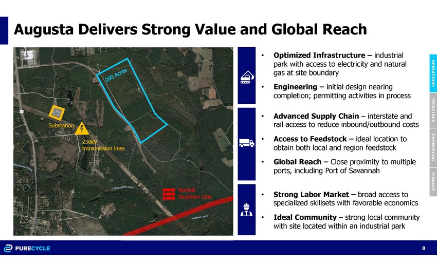 Comprehensive Selection Process for Augusta O PER A T I ON S 7 F E ED ST O C K COMMERCIAL FINANCE 50+ Sites evaluated across southeast, central and eastern United States Sites evaluated across 13 criteria: Environmental, Engineering, Supply Chain, Economic, etc. Targeted Southeast as ideal location for export and feedstock Augusta selected for strong labor market, excellent supply chain, and overall economic value