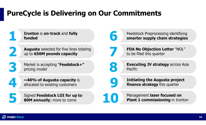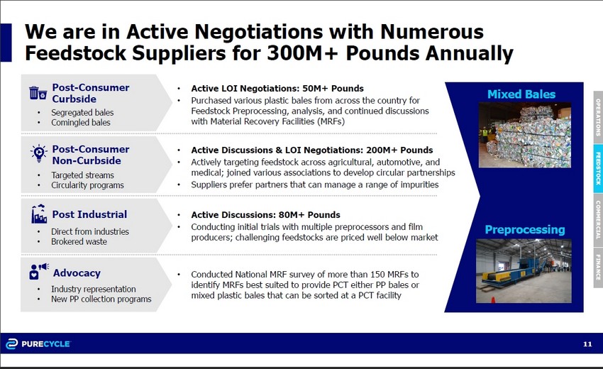 PureCycle made significant advancements in the Company’s feedstock procurement process during the second quarter and further built out the team with a number of strategic hires. The Company began nationwide canvassing of over 150 Material Reclamation Facilities (MRFs) which led to the purchases of mixed plastic bales for evaluation and processing at the Feedstock Pre-Processing facility in Ironton. The Company is currently engaged in active negotiations for over 300 million pounds of feedstock for Plant 2 in Augusta.