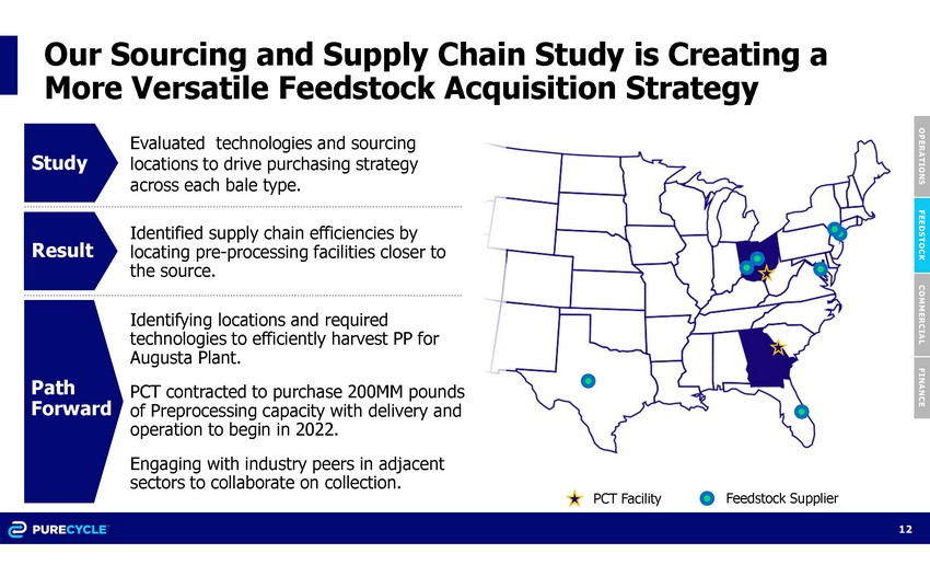 We are in Active Negotiations with Numerous Feedstock Suppliers for 300M+ Pounds Annually • Active Discussions: 80M+ Pounds • Conducting initial trials with multiple preprocessors and film producers; challenging feedstocks are priced well below market • Conducted National MRF survey of more than 150 MRFs to identify MRFs best suited to provide PCT either PP bales or mixed plastic bales that can be sorted at a PCT facility • Active Discussions & LOI Negotiations: 200M+ Pounds • Actively targeting feedstock across agricultural, automotive, and medical; joined various associations to develop circular partnerships • Suppliers prefer partners that can manage a range of impurities • Active LOI Negotiations: 50M+ Pounds • Purchased various plastic bales from across the country for Feedstock Preprocessing, analysis, and continued discussions with Material Recovery Facilities (MRFs) O PER A T I ON S F EE D S T O C K COMMERCIAL F I N A N C E P o s t - C o n s u m e r Curbside • Segregated bales • Comingled bales P o s t - C o n s u m e r Non - Curbside • Targeted streams • Circularity programs Post Industrial • Direct from industries • Brokered waste Advocacy • Industry representation • New PP collection programs Preprocessing Mixed Bales 11