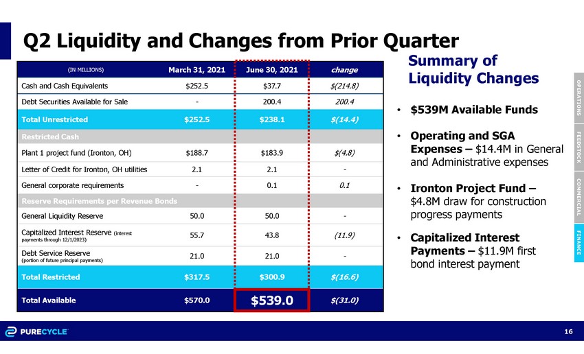 Total liquidity of $539.0 million included $238.1 million of cash, cash equivalents and debt securities available for sale and $300.9 million in restricted cash, at quarter end June 30, 2021. PureCycle had gross debt of $313.6 million as of June 30, 2021. This included $62.5 million of notes payable and accrued interest and $251.1 million of bonds payable and accrued interest.
