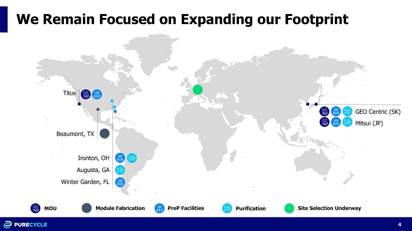 3 3 Q3 Company Update OPERATIONS FEEDSTOCK COMMERCIAL FINANCE • Ironton progressing according to schedule; Purification operational in Q4 2022; Feed PreP operational in Q2 2022 • Additional Ironton investment approved (de - risking & processing expansion); increases total project cost • 150M pounds Feed PreP processing capacity in Central Florida expected to come online in Q3 2022 • Identified 1.6 - billion - pound feedstock supply pipeline • Signed 6 new LOIs that account for 168M pounds of feedstock • Developed PureZero TM feedstock program for large venue events; first major partner is the Cleveland Browns • Active customer discussions representing 277M pounds across existing and new market segments using Feedstock+ Pricing Model • Successfully launched first commercial product with EC30, a P&G brand • Submitted FDA Letter of No Objection on September 10 • Ended Q3 2021 with $494M in total cash and investments • $45M spent progressing Ironton, Augusta, and Feed PreP facility in Central Florida (Winter Garden) • Advanced key long lead purchases expected in Q3 2021 for Augusta facility