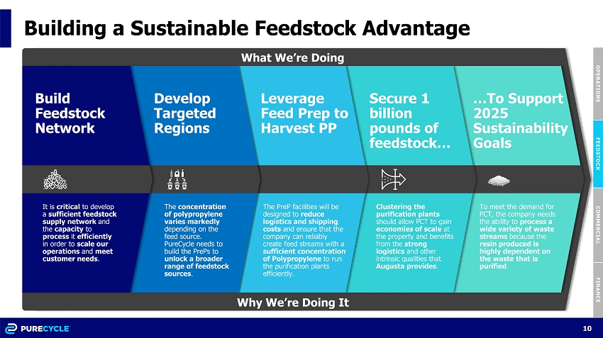 9 9 Our PreP Strategy PrePs are regional preprocessing facilities that sort, wash, and densify feedstock to prepare for purification. Designed to minimize shipping yield loss and develop local supply relationships. Unique pricing hedge opportunity for PCT. What & Why Designed to process film, fiber, and mixed plastics with capacity to deliver 126M pounds of polypropylene per year. PreP Facility Purification Plant OPERATIONS FEEDSTOCK COMMERCIAL FINANCE PreP Regions Under Evaluation Ironton (Q2 2022) Central Florida (Q3 2022) Titus (TBD) Partnership designed to target uncaptured polypropylene from initial Material Reclamation Facilities (MRFs) sortation Designed to process mixed plastics with initial capacity to deliver 75M pounds of polypropylene per year (planned to scale to 150M pounds). PreP MOU