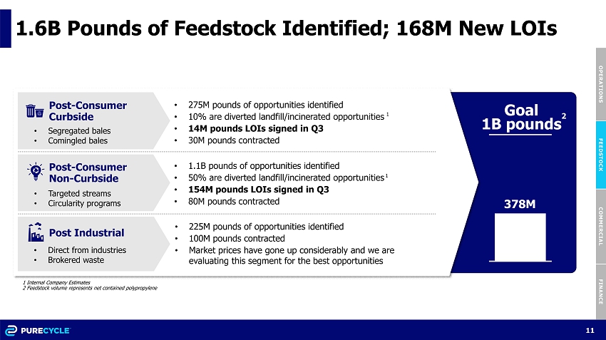 10 10 OPERATIONS FEEDSTOCK COMMERCIAL FINANCE Build Feedstock Network Develop Targeted Regions Leverage Feed Prep to Harvest PP Secure 1 billion pounds of feedstock… To meet the demand for PCT, the company needs the ability to process a wide variety of waste streams because the resin produced is highly dependent on the waste that is purified . Building a Sustainable Feedstock Advantage It is critical to develop a sufficient feedstock supply network and the capacity to process it efficiently in order to scale our operations and meet customer needs . The concentration of polypropylene varies markedly depending on the feed source. PureCycle needs to build the PrePs to unlock a broader range of feedstock sources . The PreP facilities will be designed to reduce logistics and shipping costs and ensure that the company can reliably create feed streams with a sufficient concentration of Polypropylene to run the purification plants efficiently. Clustering the purification plants should allow PCT to gain economies of scale at the property and benefits from the strong logistics and other intrinsic qualities that Augusta provides . …To Support 2025 Sustainability Goals What We’re Doing Why We’re Doing It