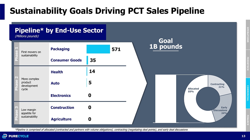 11 11 1.6B Pounds of Feedstock Identified; 168M New LOIs Post Industrial Post - Consumer Non - Curbside Post - Consumer Curbside • Segregated bales • Comingled bales • Targeted streams • Circularity programs • Direct from industries • Brokered waste OPERATIONS FEEDSTOCK COMMERCIAL FINANCE Goal 1B pounds 1 Internal Company Estimates 2 Feedstock volume represents net contained polypropylene • 275M pounds of opportunities identified • 10% are diverted landfill/incinerated opportunities • 14M pounds LOIs signed in Q3 • 30M pounds contracted • 1.1B pounds of opportunities identified • 50% are diverted landfill/incinerated opportunities • 154M pounds LOIs signed in Q3 • 80M pounds contracted • 225M pounds of opportunities identified • 100M pounds contracted • Market prices have gone up considerably and we are evaluating this segment for the best opportunities 2 1 1 378M