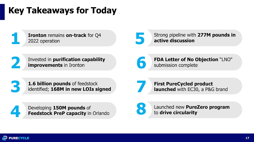 16 16 Q3 Liquidity and Changes from Prior Quarter (IN MILLIONS) June 30, 2021 Sept. 3 0, 2021 change Cash and Cash Equivalents $37.7 $36.5 $(1.2) Debt Securities Available for Sale 200.4 184.6 (15.8) Total Unrestricted $238.1 $221.1 $(17.0) Restricted Cash Plant 1 project fund (Ironton, OH) $183.9 $156.0 $(27.9) Letter of Credit for Ironton, OH utilities 2.1 2.1 - General corporate requirements 0.1 0.1 - Reserve Requirements per Revenue Bonds General Liquidity Reserve 50.0 50.0 - Capitalized Interest Reserve (interest payments through 12/1/2023) 43.8 43.8 - Debt Service Reserve (portion of future principal payments) 21.0 21.0 - Total Restricted $300.9 $273.0 $(27.9) Total Available $539.0 $494.1 $(44.9) Summary of Liquidity Changes • $494.1M Available • Operating and SGA Expenses – $ 9.3 M in General & Administrative expenses • Feed Prep and Future Capacity - $7.7M • Ironton Project Fund – $27.9M draw for construction progress payments OPERATIONS FEEDSTOCK COMMERCIAL FINANCE