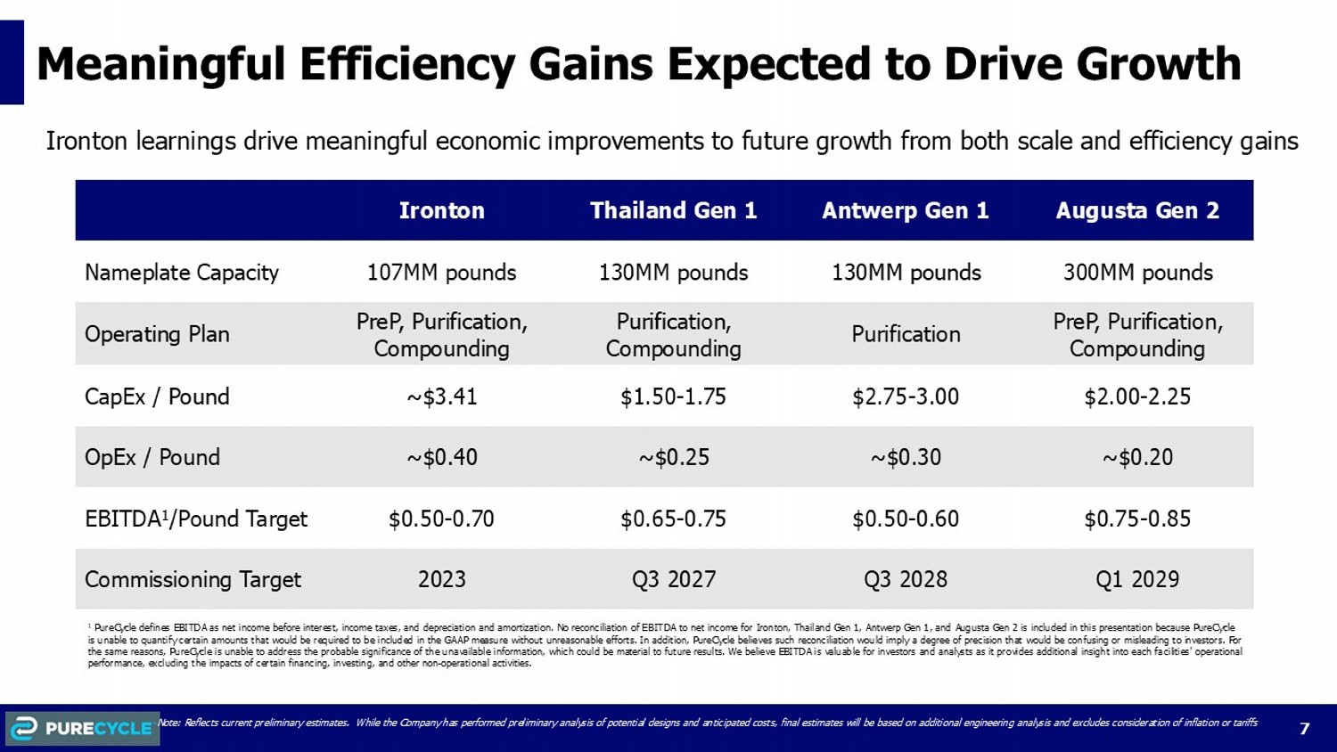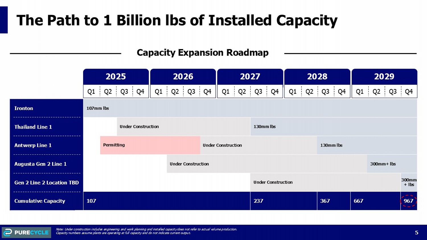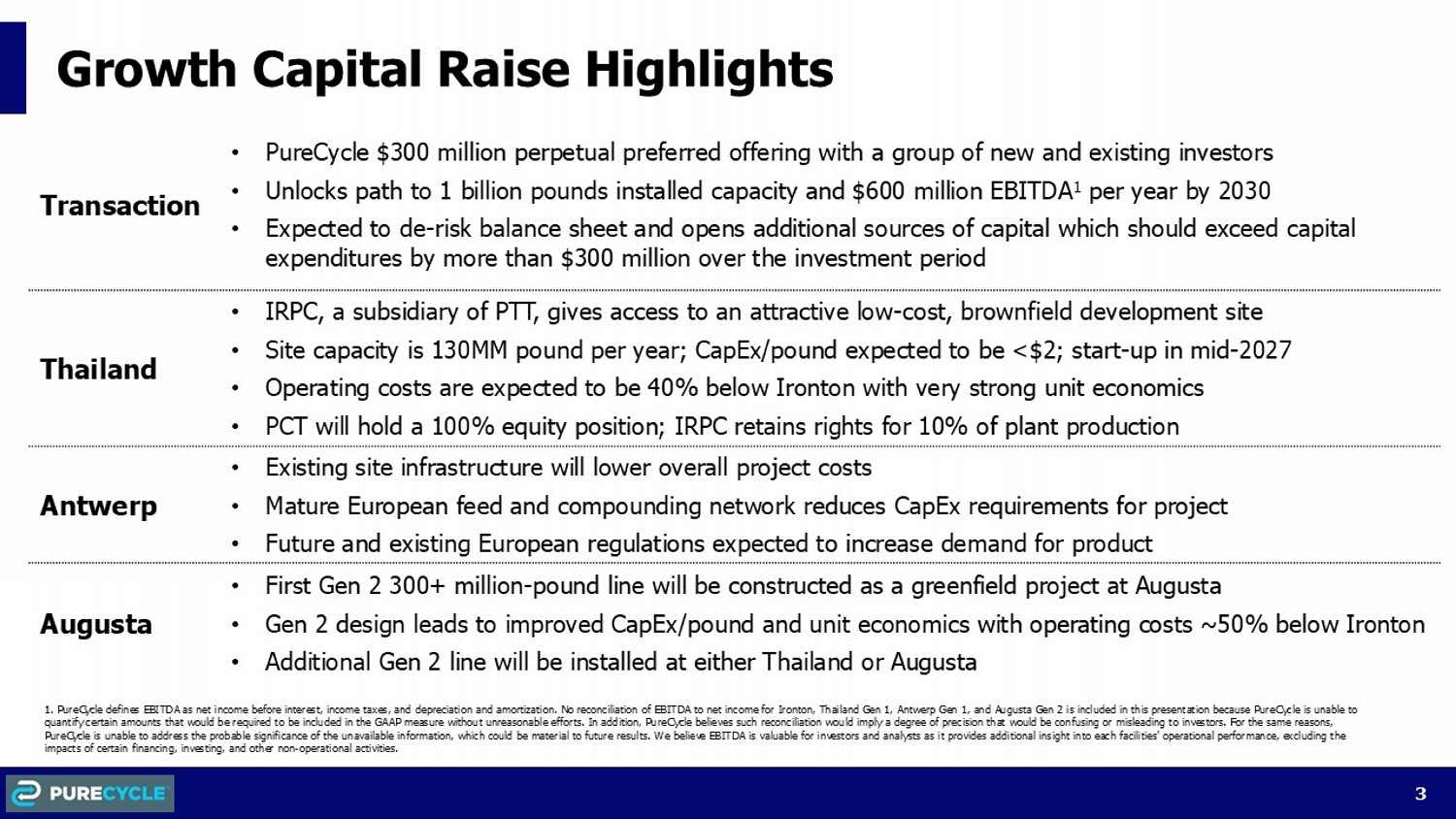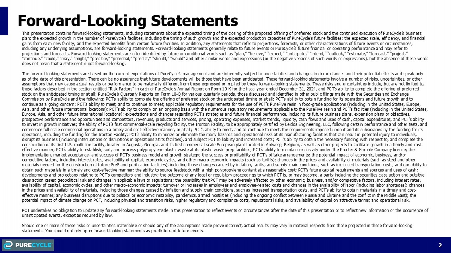 2 Confidential Information. Do Not Distribute. 2 Forward - Looking Statements This presentation contains forward - looking statements, including statements about the expected timing of the closing of the prop osed offering of preferred stock and the continued execution of PureCycle’s business plan; the expected growth in the number of PureCycle’s facilities, including the timing of such growth and the expected production capacities of PureCycle’s future facilities; the expected scale, efficiency, and financial gains from each new facility, and the expected benefits from certain future facilities. In addition, any statements that refe r t o projections, forecasts, or other characterizations of future events or circumstances, including any underlying assumptions, are forward - looking statements. Forward - looking statements generally relate to future even ts or PureCycle’s future financial or operating performance and may refer to projections and forecasts. Forward - looking statements are often identified by future or conditional words such as “plan,” “belie ve,” “expect,” “anticipate,” “intend,” “outlook,” “estimate,” “forecast,” “project,” “continue,” “could,” “may,” “might,” “possible,” “potential,” “predict,” “should,” “would” and other similar words and expres sio ns (or the negative versions of such words or expressions), but the absence of these words does not mean that a statement is not forward - looking. The forward - looking statements are based on the current expectations of PureCycle’s management and are inherently subject to uncertainties and changes in circumstances and their potential effects and speak onl y as of the date of this presentation. There can be no assurance that future developments will be those that have been anticipa ted . These forward - looking statements involve a number of risks, uncertainties, or other assumptions that may cause actual results or performance to be materially different from those expressed or implied by these for ward - looking statements. These risks and uncertainties include, but are not limited to, those factors described in the section entitled “Risk Factors” in each of PureCycle’s Annual Report on Form 10 - K for the fiscal year ended December 31, 2024, and PCT's ability to complete the offering of preferred stock on the anticipated timing or at all; PureCycle’s Quarterly Reports on Form 10 - Q for various quarterly periods, those discussed and identified in other public filings made with the Securities and Exchange Commission by PureCycle and the following: PCT's ability to complete the offering of preferred stock on the anticipated timin g o r at all; PCT's ability to obtain funding for its operations and future growth and to continue as a going concern; PCT's ability to meet, and to continue to meet, applicable regulatory requirements for the use o f P CT’s PureFive resin in food - grade applications (including in the United States, Europe, Asia, and other future international locations); PCT's ability to comply on an ongoing basis with the numerous regulatory req uir ements applicable to the PureFive resin and PCT’s facilities (including in the United States, Europe, Asia, and other future international locations); expectations and changes regarding PCT’s strategies and future finan cia l performance, including its future business plans, expansion plans or objectives, prospective performance and opportunities and competitors, revenues, products and services, pricing, operating expenses, mark et trends, liquidity, cash flows and uses of cash, capital expenditures, and PCT’s ability to invest in growth initiatives; the ability of PCT’s first commercial - scale recycling facility, the Ironton Facility, to be app ropriately certified by Leidos Engineering, LLC, following certain performance and other tests, and commence full - scale commercial operations in a timely and cost - effective manner, or at all; PCT’s ability to meet, and to contin ue to meet, the requirements imposed upon it and its subsidiaries by the funding for its operations, including the funding for the Ironton Facility; PCT’s ability to minimize or eliminate the many hazards and opera tio nal risks at its manufacturing facilities that can result in potential injury to individuals, disrupt its business (including interruptions or disruptions in operations at its facilities), and subject PCT to liability a nd increased costs; PCT’s ability to obtain the necessary funding with respect to, and complete the construction of its first U.S. multi - line facility, located in Augusta, Georgia, and its first commercial - scale European plant l ocated in Antwerp, Belgium, as well as other projects to facilitate growth in a timely and cost - effective manner; PCT’s ability to establish, sort, and process polypropylene plastic waste at its plastic waste prep facilit ies ; PCT’s ability to maintain exclusivity under The Procter & Gamble Company license; the implementation, market acceptance, and success of PCT’s business model and growth strategy; the success or profitability of P CT’ s offtake arrangements; the potential impact of economic, business, and/or competitive factors, including interest rates, availability of capital, economic cycles, and other macro - economic impacts (such as tariffs); changes in the prices and availability of materials (such as steel and other materials needed for the construction of future PreP and purification facilities), including those changes caused by inflation, tariffs, and supply chain conditions, such as incr ea sed transportation costs, and our ability to obtain such materials in a timely and cost - effective manner; the ability to source feedstock with a high polypropylene content a t a reasonable cost; PCT’s future capital requirements and sources and uses of cash; developments and projections relating to PCT’s competit