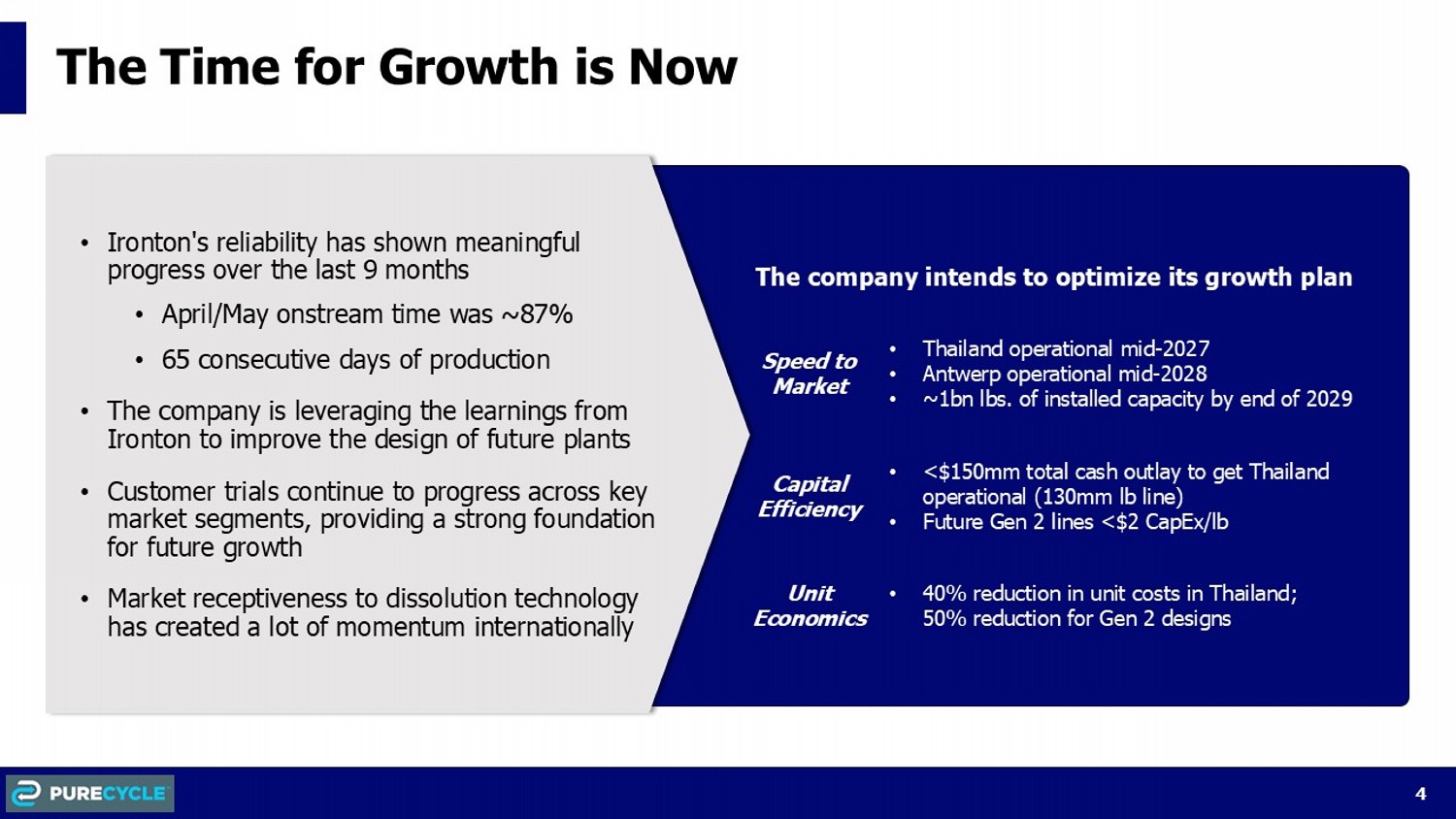 3 Confidential Information. Do Not Distribute. 3 Growth Capital Raise Highlights • PureCycle $300 million perpetual preferred offering with a group of new and existing investors • Unlocks path to 1 billion pounds installed capacity and $600 million EBITDA 1 per year by 2030 • Expected to de - risk balance sheet and opens additional sources of capital which should exceed capital expenditures by more than $300 million over the investment period Transaction • IRPC, a subsidiary of PTT, gives access to an attractive low - cost, brownfield development site • Site capacity is 130MM pound per year; CapEx /pound expected to be <$2; start - up in mid - 2027 • Operating costs are expected to be 40% below Ironton with very strong unit economics • PCT will hold a 100% equity position; IRPC retains rights for 10% of plant production Thailand • Existing site infrastructure will lower overall project costs • Mature European feed and compounding network reduces CapEx requirements for project • Future and existing European regulations expected to increase demand for product Antwerp • First Gen 2 300+ million - pound line will be constructed as a greenfield project at Augusta • Gen 2 design leads to improved CapEx /pound and unit economics with operating costs ~50% below Ironton • Additional Gen 2 line will be installed at either Thailand or Augusta Augusta 1. PureCycle defines EBITDA as net income before interest, income taxes, and depreciation and amortization. No reconciliation of EBITDA to net income for Ironton, Thailand Gen 1, Antwerp Gen 1, and Augusta Gen 2 is included in this presentation because P ur eCycle is unable to quantify certain amounts that would be required to be included in the GAAP measure without unreasonable efforts. In addition, Pu reCycle believes such reconciliation would imply a degree of precision that would be confusing or misleading to investors. Fo r t he same reasons, PureCycle is unable to address the probable significance of the unavailable information, which could be material to future re sul ts. We believe EBITDA is valuable for investors and analysts as it provides additional insight into each facilities' operatio nal performance, excluding the impacts of certain financing, investing, and other non - operational activities.