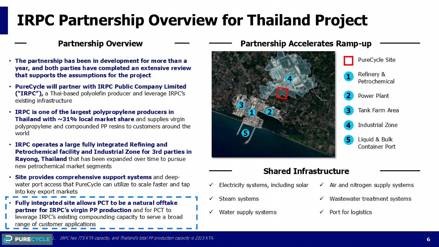 6 Confidential Information. Do Not Distribute. 6 IRPC Partnership Overview for Thailand Project 1. IRPC has 775 KTA capacity, and Thailand's total PP production capacity is 2515 KTA. Partnership Accelerates Ramp - up • PureCycle Site • Refinery & Petrochemical • Power Plant • Tank Farm Area • Industrial Zone • Liquid & Bulk Container Port 1 2 3 4 5 4 2 1 3 5 x Electricity systems, including solar x Steam systems x Water supply systems x Air and nitrogen supply systems x Wastewater treatment systems x Port for logistics • The partnership has been in development for more than a year, and both parties have completed an extensive review that supports the assumptions for the project • PureCycle will partner with IRPC Public Company Limited (“IRPC”), a Thai - based polyolefin producer and leverage IRPC’s existing infrastructure • IRPC is one of the largest polypropylene producers in Thailand with ~31% local market share and supplies virgin polypropylene and compounded PP resins to customers around the world • IRPC operates a large fully integrated Refining and Petrochemical facility and Industrial Zone for 3rd parties in Rayong, Thailand that has been expanded over time to pursue new petrochemical market segments • Site provides comprehensive support systems and deep - water port access that PureCycle can utilize to scale faster and tap into key export markets • Fully integrated site allows PCT to be a natural offtake partner for IRPC’s virgin PP production and for PCT to leverage IRPC’s existing compounding capacity to serve a broad range of customer applications Shared Infrastructure Partnership Overview
