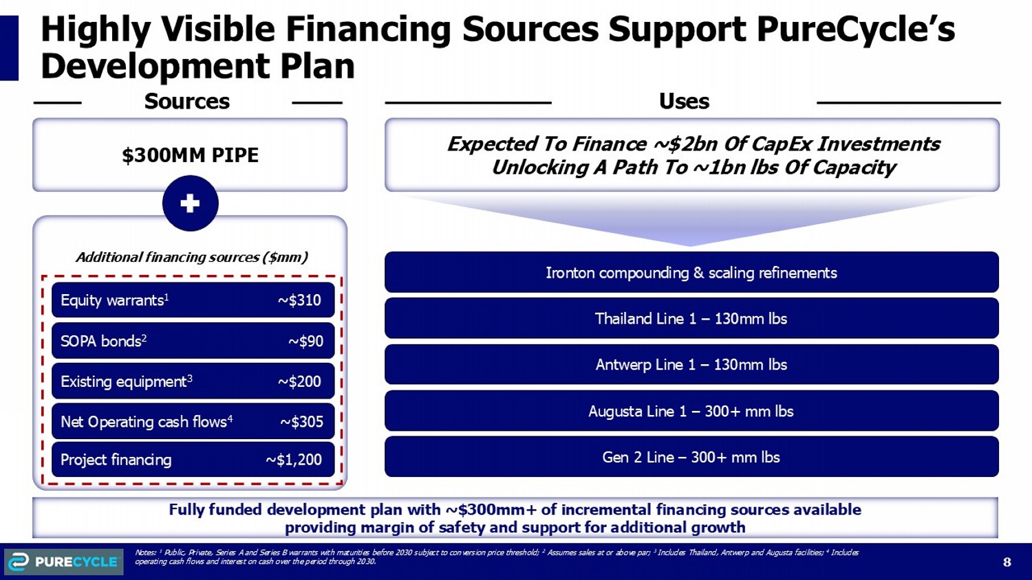7 Confidential Information. Do Not Distribute. 7 Meaningful Efficiency Gains Expected to Drive Growth Augusta Gen 2 Antwerp Gen 1 Thailand Gen 1 Ironton 300MM pounds 130MM pounds 130MM pounds 107MM pounds Nameplate Capacity PreP , Purification, Compounding Purification Purification, Compounding PreP , Purification, Compounding Operating Plan $2.00 - 2.25 $2.75 - 3.00 $1.50 - 1.75 ~$3.41 CapEx / Pound ~$0.20 ~$0.30 ~$0.25 ~$0.40 OpEx / Pound $0.75 - 0.85 $0.50 - 0.60 $0.65 - 0.75 $0.50 - 0.70 EBITDA 1 /Pound Target Q1 2029 Q3 2028 Q3 2027 2023 Commissioning Target Ironton learnings drive meaningful economic improvements to future growth from both scale and efficiency gains 1 PureCycle defines EBITDA as net income before interest, income taxes, and depreciation and amortization. No reconciliation of E BITDA to net income for Ironton, Thailand Gen 1, Antwerp Gen 1, and Augusta Gen 2 is included in this presentation because Pu reC ycle is unable to quantify certain amounts that would be required to be included in the GAAP measure without unreasonable efforts. In addition, PureCycle believes such reconciliation would imply a degree of precision that would be confusing or misleading to i nv estors. For the same reasons, PureCycle is unable to address the probable significance of the unavailable information, which could be mat eri al to future results. We believe EBITDA is valuable for investors and analysts as it provides additional insight into each fa cil ities' operational performance, excluding the impacts of certain financing, investing, and other non - operational activities. Note: Reflects current preliminary estimates. While the Company has performed preliminary analysis of potential designs and ant icipated costs, final estimates will be based on additional engineering analysis and excludes consideration of inflation or t ari ffs